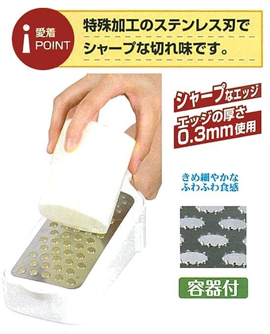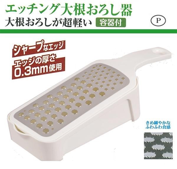 特殊加工のステンレス刃でシャープな切れ味の大根おろし器。エッジの厚さは0.3mm使用。きめ細やかなふわふわ食感に仕上がります。