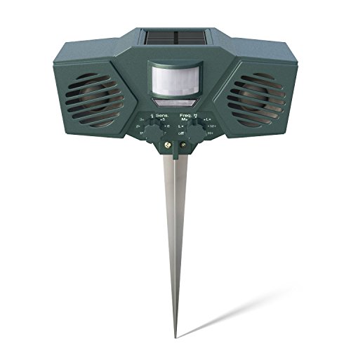 -. Feature : GET RID OF ALL ANIMAL INTRUDERS - Blasts all animal intruders out of your property by emitting powerful ultrasonic sounds and flashing LED lights. Eliminate roaming pest animal problems with this aggressive ultrasonic and flashing light animal repeller. Features three (3) ultrasonic frequency settings, plus an optional on/off LED flashing light. / HOW IT WORKS - Blasts a range of powerful ultrasonic sounds and flashing LED strobe lights to scare away a wide variety of pests. / SOLAR POWERED & EASY TO INSTALL - Simply take it out of the box, stick it into the ground with the included metal stake, and select your desired settings (features 3 ultrasonic frequency settings, an optional on/off LED light, and 7 sensitivity settings). Features a solar panel on top of the device that recharges the batteries (3 AA rechargeable batteries included). / Can also be recharged via USB (A USB charging cable is included). / HUMANE & ENVIRONMENT FRIENDLY - No messy chemicals or pesticides, no traps, no dead animals. Get rid of all animals through emitting a mixture of ultrasonic sounds and powerful flashing LED strobe lights, frightening the intruding animals and pests to leave the area. / WEATHERPROOF & WATER-RESISTANT - Solid hard plastic construction for withstanding years of rain, snow, ice and wind. Perfect for yards, patios, driveways, garages, attics, porches, boats, gardens, farms, ponds, etc. / PIR Motion sensor: Detects motion from up to 30 Ft. / Size: 6" x 3.5" x 2" / New Upgraded components for optimal performance.
