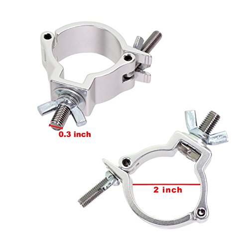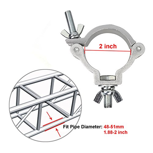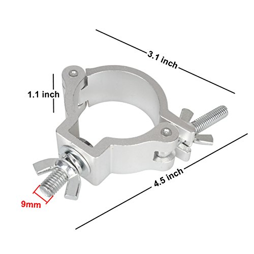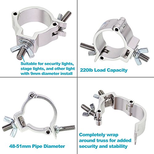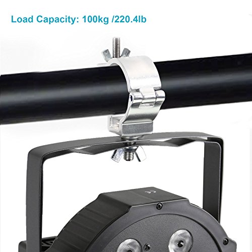 Studio : GBGS Publisher : GBGS Binding : Electronics Product Description Features: - Heavy duty aluminum alloy material stage light hook clamp - Quick and easy to attach, remove or re-position of your light - Completely wrap around truss for added security and stability. - Suitable for security lights, stage lights, and other light with 9mm diameter install hole - Ideal using in stage, DJ, Bar, Pub, Event, Theatre, Disco.... - TUV Rheinland certified Specifications: - Material: Aluminum Alloy - Fit Pipe Diameter: 2 inch / 48-51mm - Threaded Bolt: 9mm - Width: 30mm - Load Capacity: 1-100kg / 1-220lb - Size: 4.4 x 3.1 x 1.1 inch - Gross Weight: 180g Notes: - Do a max load capacity test before use Package Included: 8 x Stage Light Clamp 0