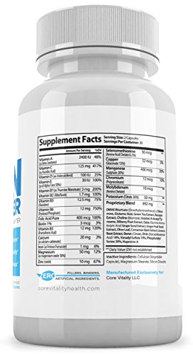 Do you sometimes feel like you are only half-there in your daily conversations because you lack concentration, or mental focus? With Core Vitality's Brain Booster formula you will no longer be about your lack of mental focus. This supplement helps by improving mental clarity and focus, boosting cognition, memory function, and increasing your level of concentration and alertness. As an added bonus, Core Vitality's Brain Booster can provide you with an increased level of energy and improved mood. 41 Ingredient Blend - For optimum cognitive function Dimethylethanolamine - Elevates mood, supports learning by promoting production of the neurotransmitter, acetylcholine PHOSPHATIDYLSERINE 20% - Supports retention of information, learning and nerve cell health L-GLUTAMINE - Helps reduce stress, supports mental alertness CHOLINE - Important macronutrient to support cognitive functioning INOSITOL - A valuable natural remedy to calm anxiety and panic attacks N-ACETYL L-TYROSENE - Supports mood HUPERZINE-A - Supports nerve health, memory, learning and alertness GRAPE SEED EXTRACT - Boosts cerebral oxygen flow GRAPE AND GRAPEFRUIT SEED EXTRACT - Contains the polyphenolsPterostilbene and Resveratrol for cognitive enhancement OTHER BENEFICIAL INGREDIENTS: GABA, Bacopa Monnieri Leaf, Bilberry Fruit Extract, Olive Leaf, Cinnamon Bark Extract, Licorice Root Extract, Borom, DHA 14%, Vanadyl Sulfate 19%Feature