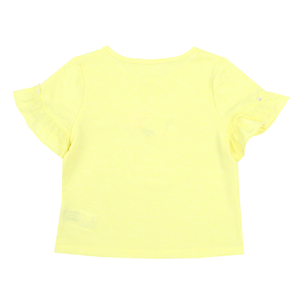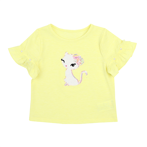 상품설명 옐로우 인어공주 티셔츠 입니다. 옐로우 컬러 티셔츠로 소매에 제원단프릴과 샤프릴+진주장식이 러블리한 느낌을 줍니다. 또한 고양이 자수포인트가 러블리한 느낌을 줍니다. 어떠한 바텀류와도 코디가 좋습니다.