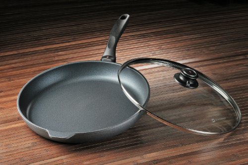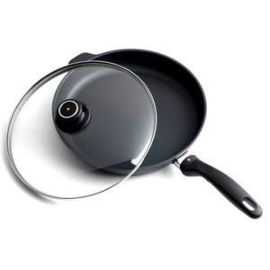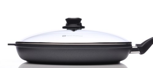 Swiss Diamond's largest fry pan, the 32 cm (12.5”) skillet can accommodate pork chops and other large cuts of meat. The diamond-reinforced coating browns and sears like stainless steel with no-hassle clean-up when the meal is done. Recommended by the American Vegetarian Association (AVA) for vegan and vegetarian recipes, and designed for cooking without added oils or fats, Swiss Diamond can help you reach your health and weight loss goals. A matching tempered glass lid with adjustable steam vent is included. The included tempered glass lid allows you to monitor food without lifting the cover, maintaining flavor and keeping food from drying out. The rotating lid knob opens or closes a steam vent to release or contain moisture as needed. Used by discerning home chefs around the world, Swiss Diamond’s PFOA-free cookware features unsurpassed nonstick performance for healthy cooking and easy clean-up. The patented nonstick coating, reinforced with real diamond particles, allows oil-free cooking and cleans up with just warm soapy water. No more scrubbing and soaking! Swiss Diamond’s patented nonstick coating is reinforced with real diamonds for excellent durability and resilience. Why diamonds? Three reasons: they are durable, they are naturally nonstick, and they conduct heat better than any metal. A perfect combination for a lifetime of cooking excellence. Swiss quality is visible in every aspect of Swiss Diamond cookware. Heavy-duty cast aluminum will never warp, while the perfectly flat base distributes heat evenly and will not tip or spin. The rivet-free interior prevents unsightly food build-up that can lead to bacterial growth. The ergonomic handle, designed for comfort and balance, stays cool on the stovetop. All Swiss Diamond products are oven-safe up to 500 degrees F (260 degrees C) and suitable for use on gas and electric cooktops – induction series sold separately. Made in Switzerland with an eco-friendly production process.Feature