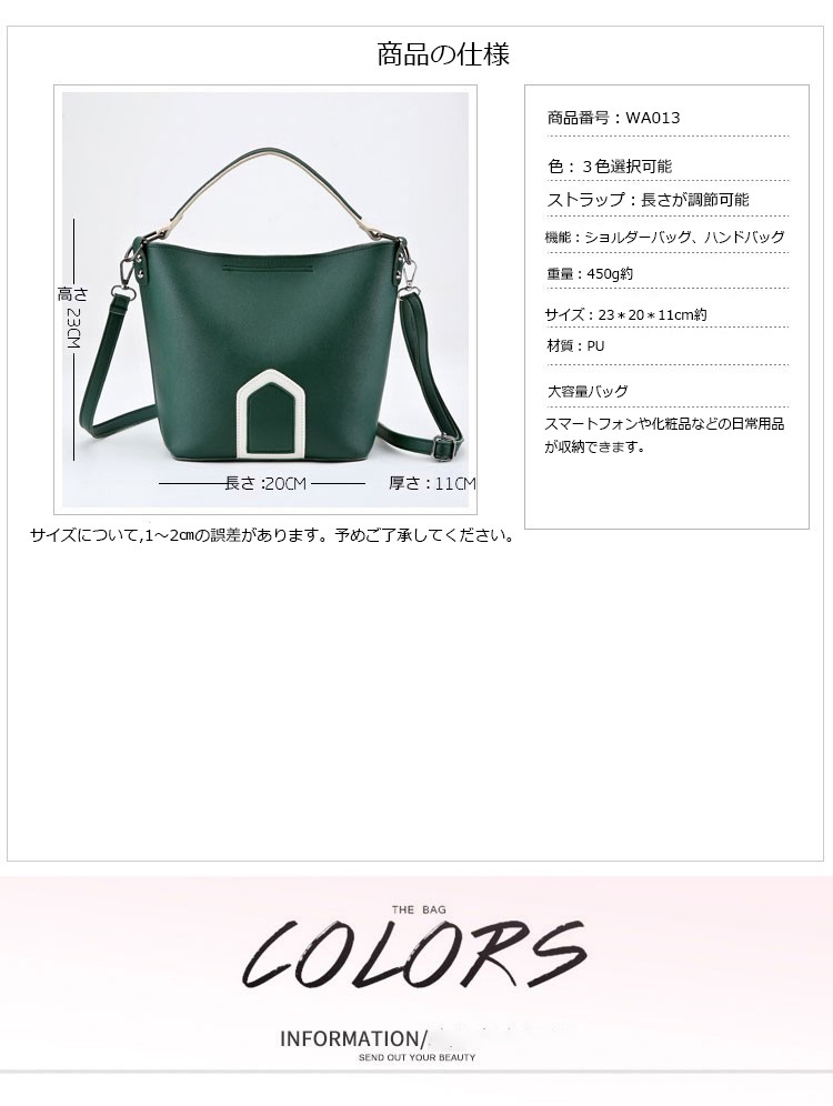 商品番号:WA013商品説明:◆伸縮性:有り◆厚さ:普通◆素材:PU、ポリエステル、金属◆バッグのサイズ:長さ:20cm約 厚さ:11cm約 高さ:23cm約 ストラップ付き(調節可能)◆色:ホワイト、グリーン、ブラック◆重量:450g約◆商品内容:1xバッグ特徴:【軽量、携帯便利】バッグが、軽量で、携帯便利です。出掛けに最適!!コンパクトサイズのショルダーバッグ。内ポケット付きです。【ファッションなデザイン】欧米風なファッションのバッグなので、通勤や通学にも適用します!!【多彩な色】三種類な色を選択可能です。簡単的にファッションなデザインのカバンです。おすすめです。