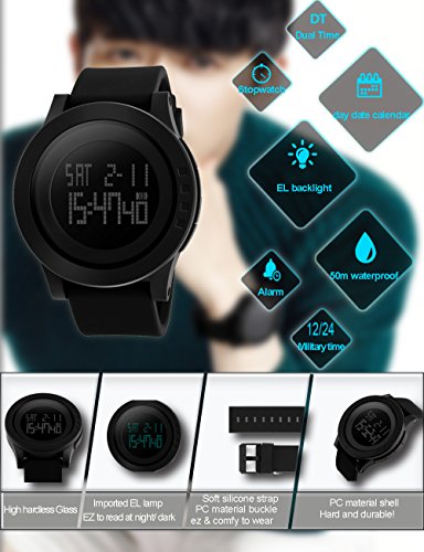 COMFORTABLE DAILY WEARING & STYLISH DESIGN:Silicon watch straps brings you super soft, flexible and durable experience; big face, stylish minimalism black design makes the digital sports watch blend for any occasion