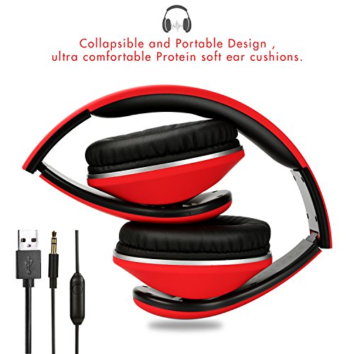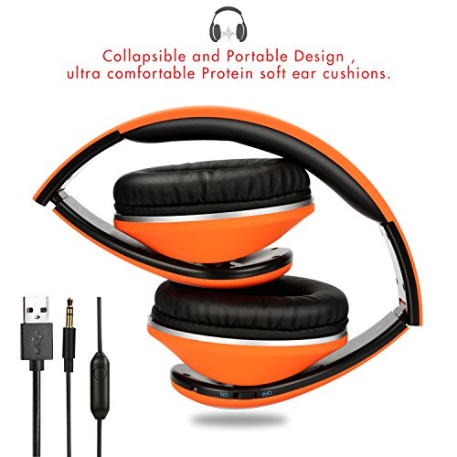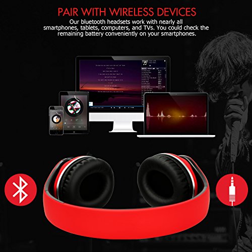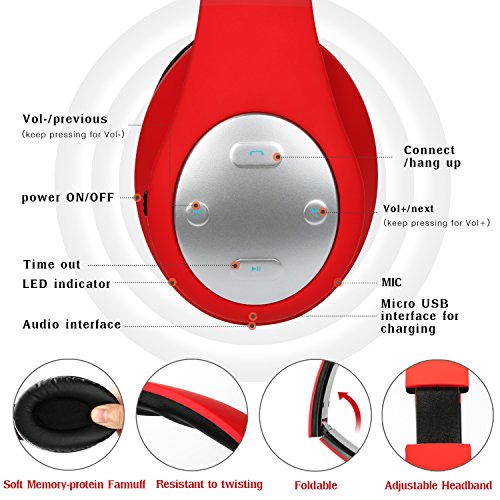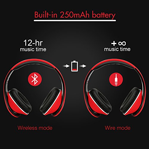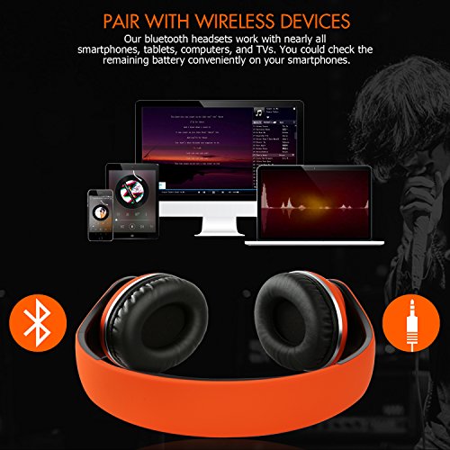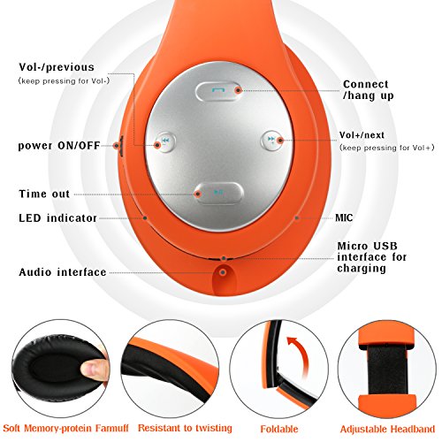 -. Feature : Wireless + Wired Mode, Bluetooth headphones over ear built-in 250mAh battery provides up to 12-hr music time/15-hr talking time in a single charge. Over-ear stereo headset also have a backup audio port, you can use the audio cable to connect to your phones without worrying about running out of battery. / Hands Free Call + Built-in Mic,Use microphone over ear headphones no need to worry about missing call when you are away from phone, you can answer or hang up your calls more freely via the buttons on the headphone. Please Note: The Microphone only works in the wireless mode. Wireless Bluetooth headset provides a quick and stable connection with your devices like cell phones, tablets, pc, TVs within 33 feet. Over-ear Stereo Headphones with a high-quality built-in microphone for hands-free calls. / Keep Your Ear Comfortable, Rechargeable Bluetooth headphones with the Memory-protein ear cushion simulate human skin texture make sure lasting comfort for you even you wearing headphones for a long time. Wireless over ear headset made of stainless steel sliding block and the head of the soft belt can is suitable for your head, they are excellent durability. / Gentle Reminder, Because of the size of everyone head/ear/shape is different, someone will feel a little tight (feel like "ears") this is to avoid leak sound. In this case, to get the sound and wearing comfort, please remove Bluetooth headphones over ear every 1 to 2 hours, giving ears to relax, and protect them from use in the bad environment. / Collapsible + Portable Design, This collapsible Bluetooth headset can be fold down to a compact, save more space when on storage if you need to put it in your bag. Fordable Stereo Bluetooth headphones with 4 button control, including Play/pause, answer, Next track, volume up/Previous track, volume down/ Previous track.