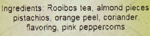 -. Feature : Festive rooibos tea blend / High quality Rooibos is used as a base / Caffeine free; Sugar free / Ingredients: All natural - rooibos, planed almond pieces, pistachios, orange peels, coriander, flavoring, pink peppercorns / Infusion is copper-colored