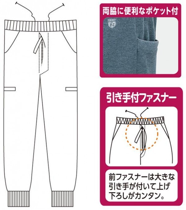 股の部分にはデオドランテープで消臭加工を施すなど多機能のパンツです。裾が足首にフィットしているのでつまづき防止になります。 製造国:中国 素材・材質:ポリエステル80%・綿20% 仕様:ウエスト総ゴム両脇ポケット洗濯機洗い可