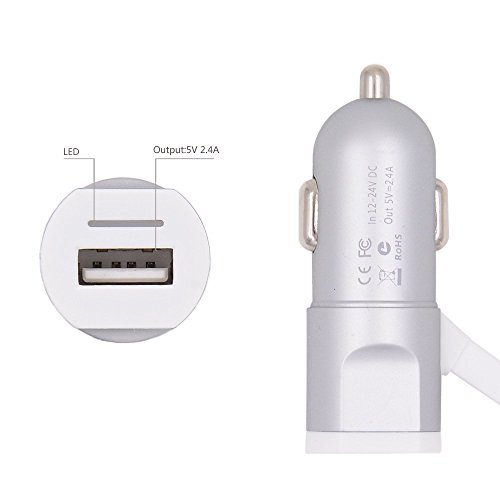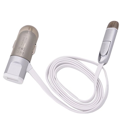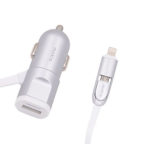 Car Charger, Mokis USB Car Charger Cord 2.4 amps with Build in 3.3ft Lightning & Micro USB Cable Convertible for iPhone / Galaxy note 5 / Galaxy S7 / Galaxy S7 Edge / LG and more devices (Silver)