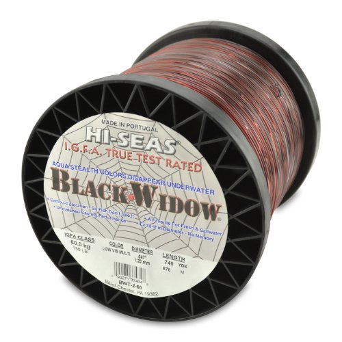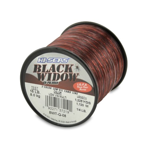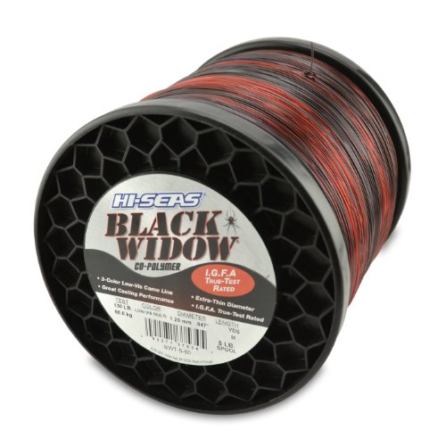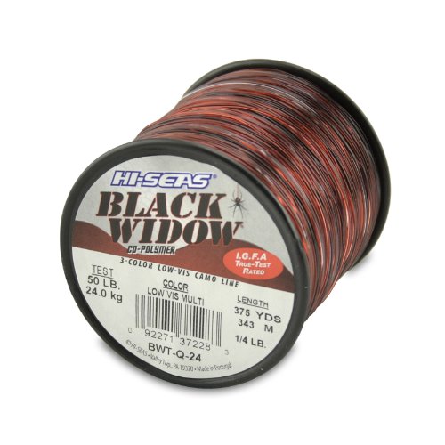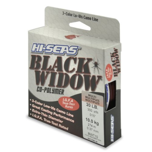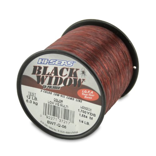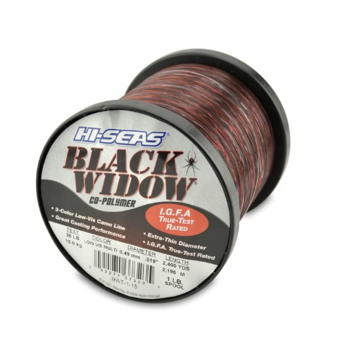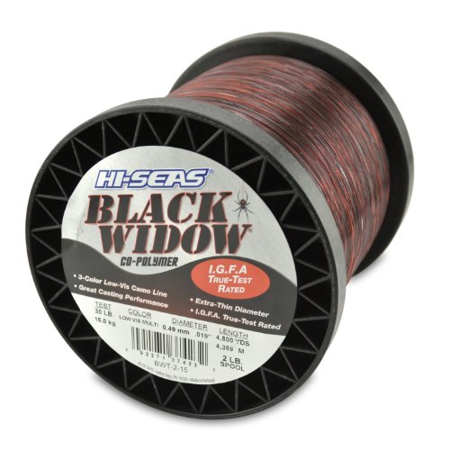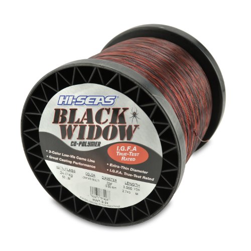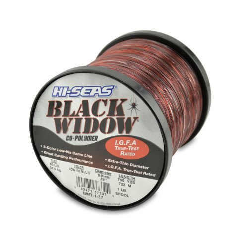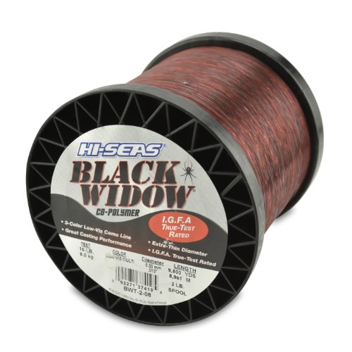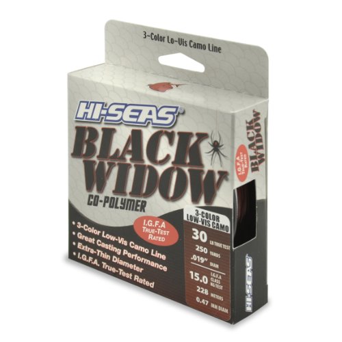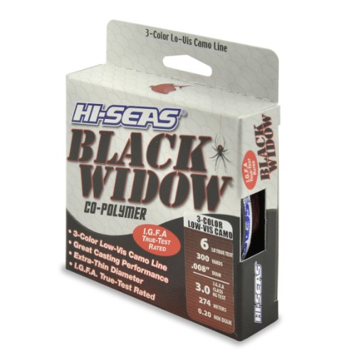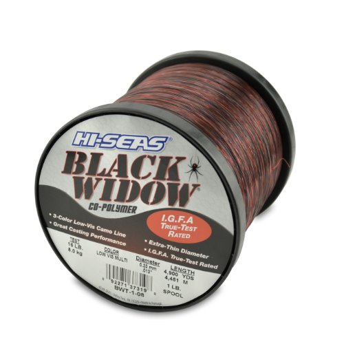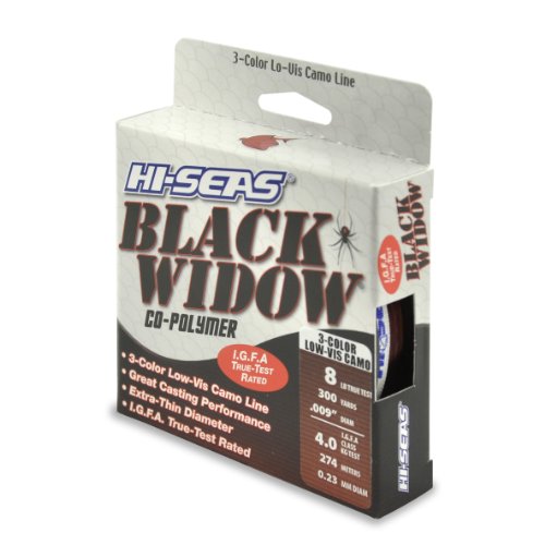 ReleaseDate : 2011-03-18 Studio : Hi-Seas Publisher : Hi-Seas Binding : Sports Product Description Black Widow has been a favorite with fresh and saltwater anglers since its introduction. It’s a thin-diameter, premium co-polymer monofilament that incorporates multicolor camouflaging technology, so fish don’t see it. But that’s only one of the reasons you’ll love it. Black Widow is a supple line that lies beautifully on any reel and casts with near zero friction. It has low memory, so it won’t coil up after sitting on the reel for extended periods, and it’s a tough line that provides solid fish-fighting performance. For the record-conscious angler, it’s I.G.F.A. True-Test rated. Whether you jig for smallmouths, troll for walleyes, plug stripers, or chunk tuna, Black Widow is a proven performer that won’t let you down when the fishing heats up. 0