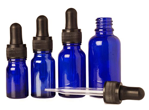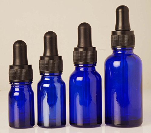 Lot Of 6 Blue Glass Pipettes With Black Cap Essential Oils Empty Container Round Bottles 5 ml