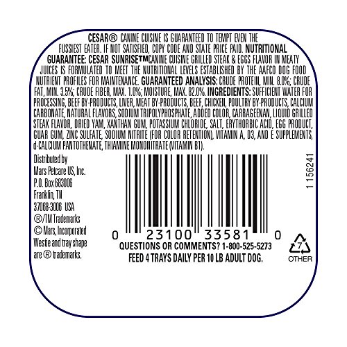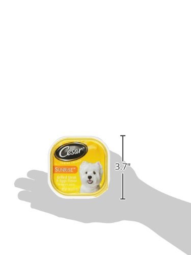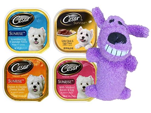 -. Title : Cesar Sunrise Dog Food 4 Flavor 8 Can with Toy Bundle: (2) Scrambled Egg & Sausage, (2) Grilled Steak & Eggs, (2) Chicken & Cheddar Cheese Souffle, & (2) Smoked Bacon & Egg, (1) Toy, 3.5 Oz. Ea.