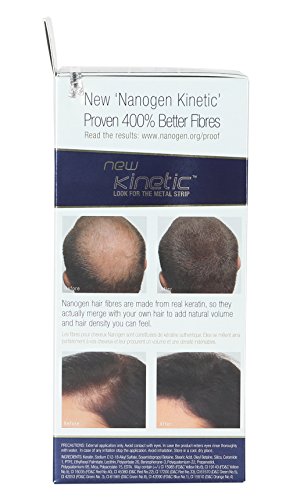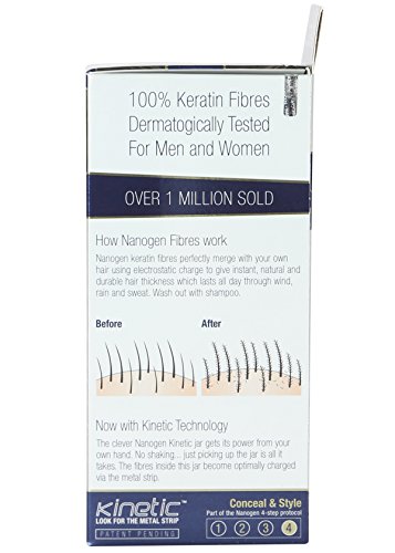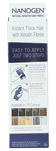 "Imagine if you never had to worry about the appearance of thinning hair again? You can regain that great feeling of confidence you had years ago when a full head of hair was something you took for granted! Hair will look thicker instantly. Bald patch will disappear within seconds. Will stay intact till your next shampoo Regain the feeling of confidence with a full head of hair Easy to apply. Natural look Electrostatically charged to bond with our existing hair. Does not stain or smear. Made in UK Colors Available: Black, Light Brown, Medium Brown, Dark Brown Easy to Apply: -Nanogen Fibres are applied quickly and without mess by simply shaking the unique container over thin or thinning hair. This releases thousands of microscopic colour-matched hair fibres, which bind electrostatically to, and branch off of, each individual hair. Charged with static electricity, they bond to your own hair in fir-tree patterns, creating a natural looking and natural feeling density. Undetectable, Natural Appearance: - Nanogen Fibres actually merge with your own hair, adding real volume, allowing styling like you never again thought possible. Every time you look in the mirror you will be truly amazed by the natural results that are virtually undetectable to the naked eye. Patent Pending Technology: - Nanogen Fibres benefit from a patent pending Electrostatic Coating and Electrostatic Strip. These innovations intensify the hair thickening effect created by Nanogen Fibres. Nanogen Fibres have been independently proven to create unrivalled hair density you can really see. Hazards and Cautions :- For external use only, Avoid contact with eyes, In case of irritation cease use.Feature