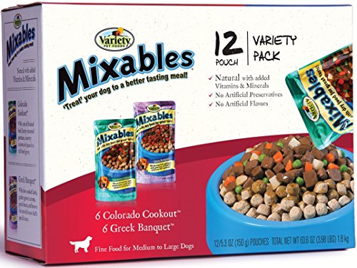 -. Binding : Misc. -. Brand : Variety -. EAN : 0876940000819 -. Feature : Mixable is the original wet dog food designed to mix with any dry dog food; Mixable recipes come in easy to open and use pouches / Natural with Added Vitamins and Minerals / No Artificial Flavors and No Preservatives / Prepared and Made with Pride in the USA / Cape Cod and Tuscan Grille are formulated to meet the nutritional levels established by AAFCO Dog Food Nutrient Profiles for Growth and Maintenance -. Label : Variety -. Manufacturer : Variety -. Model : 00081 -. MPN : 00081 -. PackageQuantity : 1 -. PartNumber : 00081 -. ProductGroup : Pet Products -. ProductTypeName : PET_SUPPLIES -. Publisher : Variety -. Size : 127.2 -. Studio : Variety -. Title : Variety 00081 12/5.3-Ounce Mixables Mixed Grille Natural Dog Food, Includes 6-Colorado Cookout and 6-Greek Banquet, 2-Pack -. UPC : 876940000819