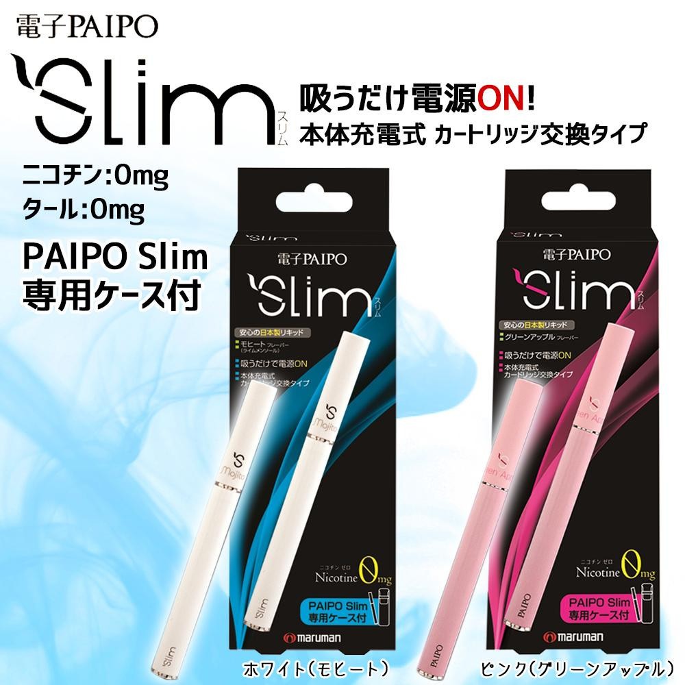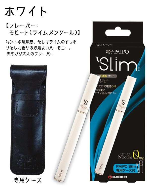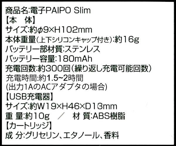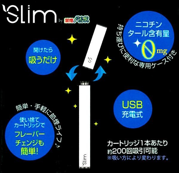 カートリッジタイプの「電子パイポ」です。Slimは吸うだけで電源ONの簡単操作、1つのカートリッジで約200回の吸引が可能♪リキッドが無くなったら吸い口部分のカートリッジを交換。使い捨てカートリッジなのでフレーバーチェンジも楽々!!カートリッジは日本製でニコチン0mg・タール0mg・プロピレングリコール(PG)不使用!!専用ケースとUSB充電器付。 |