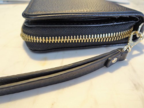 Feature : Kate Spade New York pebbled leather wristlet wallet with gold toned hardware / Detachable wristlet strap with drop of approx. 7 inches / Forward compartment with central snap closure features 19 card slots, 1 ID slot, and 4 bill-sized slip pockets / Rear compartment is gusseted with a central zip pocket / Approx. dimensions: 7.5 in (L) x 4.25 in (H) x 1 in (W)