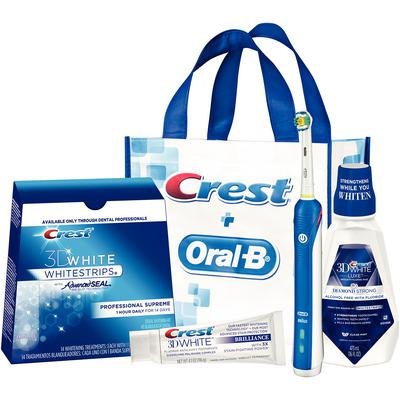 Studio : Oral-B Publisher : Oral-B Binding : Misc. Product Description NOTE: THIS IS THE DENTAL OFFICE VERSION IN WHITE. Oral-B Professional Healthy Clean Gum Care provides dentist-inspired cupping action in which a unique, round brush head surrounds each tooth for a tooth-by-tooth clean. Removes up to 97% of plaque from hard-to-reach places Helps prevent and reverse gingivitis Pressure sensor stops pulsations when you're brushing too hard Naturally whitens teeth in 21 days Contains: Oral B PRO 300 Professional Exclusive Power Toothbrush Crest Pro-Health [HD] Toothpaste [4.1oz] Crest 3D White Luxe Diamond Strong Mouthwash (473 ml) Crest 3D White Whitestrips Professional Supreme with AdvanceSeal (14 Treatments per box) 0