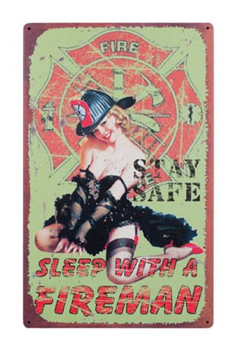 Stay Stay Safe! Sleep With Fireman, FUNNY TIN SIGN, Fire Station Decor Pinup Girl, Vintage Retro Metal Sign