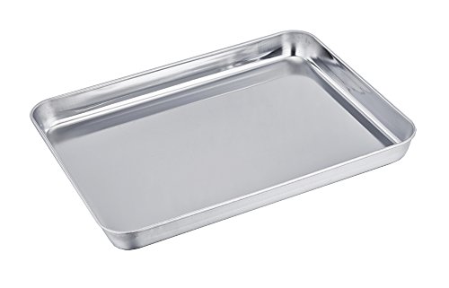 ADVANTAGE HEALTHY - Pure stainless steel without any coating or other materials CRAFE - Superb mirror polish surface, Smooth rolled edge no rough spot HEAVY DUTY - Thick gauge with solid construction, Proper weight to work with EASY CLEAN - Less stick surface baking beautifully, Easy clean and Dishwasher safe MULTI USAGE - Used as toaster oven pan, serving tray, small baking sheet, etc