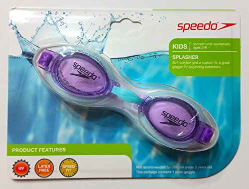 -. Title : Speedo Kid's Splasher Goggles Latex, Free UV Protection and Speed Fit for Recreational Swimmers Ages 3 - 8 Years Old (Purple Dream) - Light blue frame with Purple Lenses