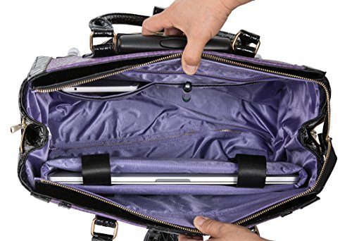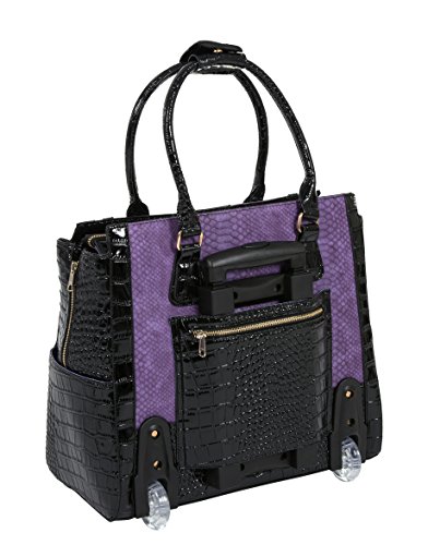 -. Feature : Carry-on size for most airlines. Fits under most airline seats with handles down and turned sideways. Purple faux python & black patent style faux alligator exterior. Stylish rolling laptop tote bag, briefcase, carryall or weekender travel rolling bag. / Gold tone hardware plus a lovely center pendant. Two tassel accents. Convenient side pockets with side expansion zippers. / Removable padded pocket will fit your tablet, iPad, 12", 13", 14", 15, 16" or 17" laptop. **Laptops are measured corner to corner diagonally.** The main compartment of the bag will fit up to a 18.5" inch laptop (measured corner to corner diagonally). If you place your laptop in the main compartment of the bag, we suggest using a laptop sleeve for added protection. Our padded laptop pocket can be easily removed to make a larger interior space. / Fully lined light purple interior with zipper pocket and two open pockets. Zipper top closure. Exterior back side zipper pocket. / Pull out retractable handle plus two durable inline style wheels for easy mobility wherever you may travel.