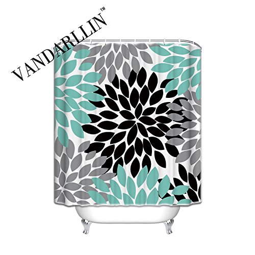 Mandala Dahlia Flower Print Waterproof Shower Curtains Set with Hooks,72 x 72 Inch ,Black Grey Green