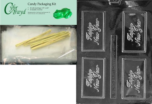 Cybrtrayd "Happy New Year" Business Card Chocolate Candy Mold with Packaging Bundle of 25 Cello Bags, 25 Gold Twist Ties and Chocolate Molding Instructions