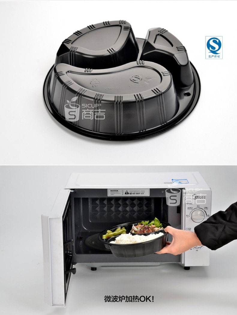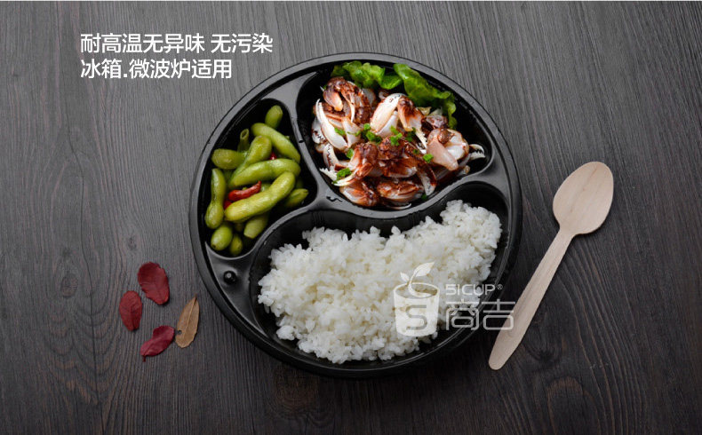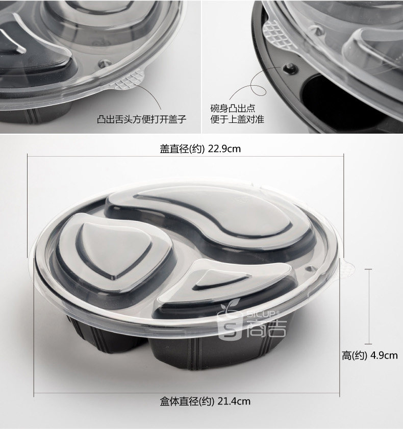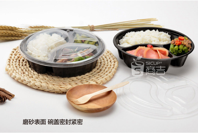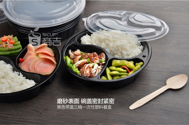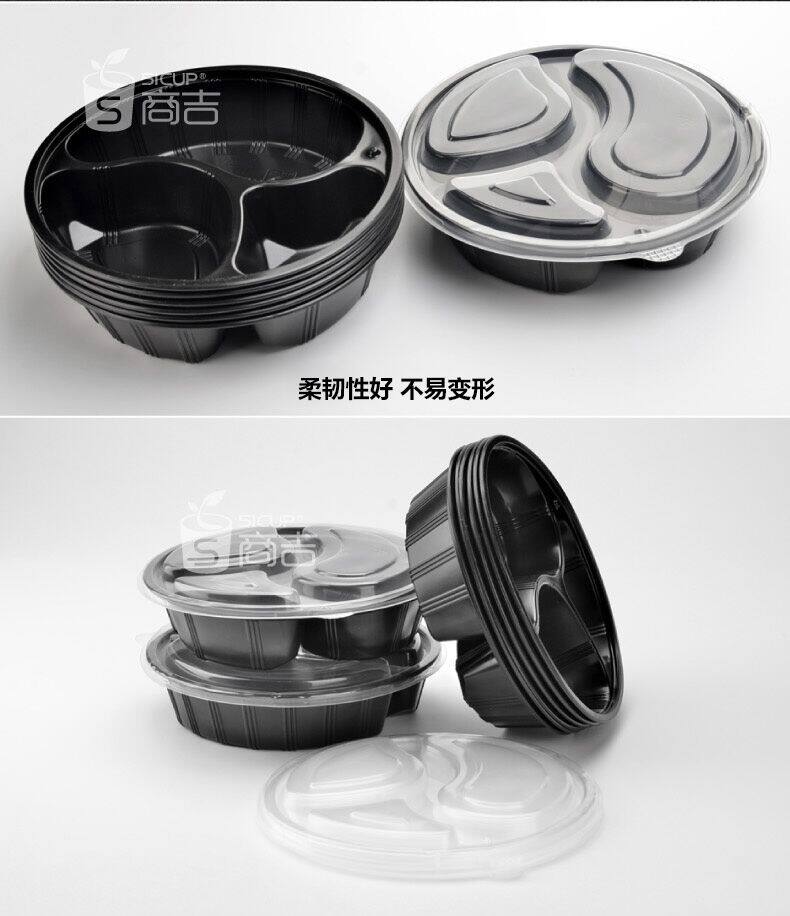高档黑色圆形三格塑料打包盒一次性快餐盒外卖饭盒便当盒50套