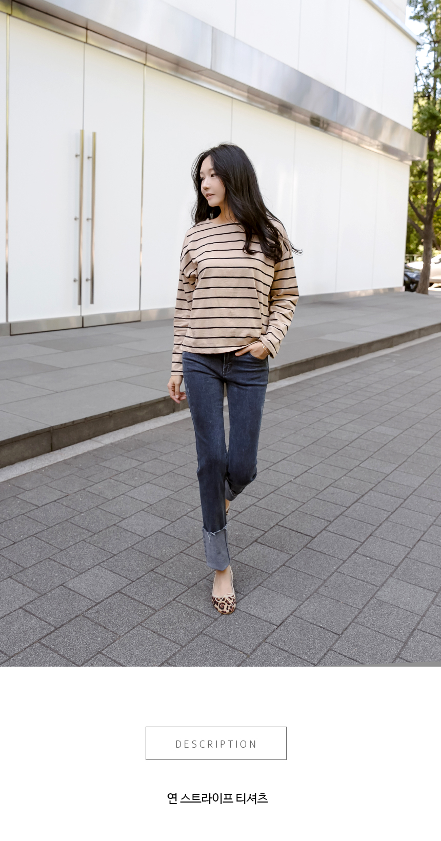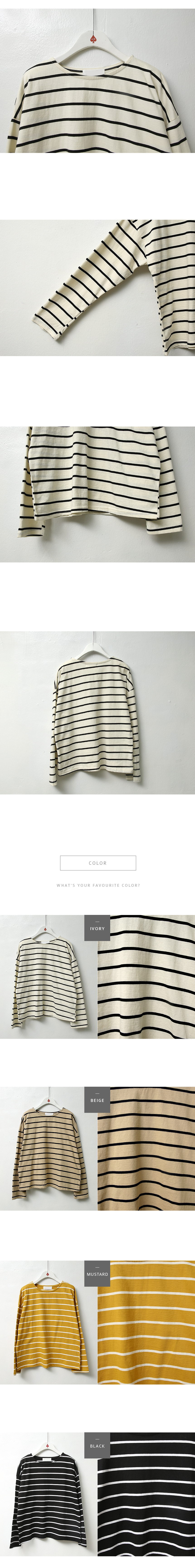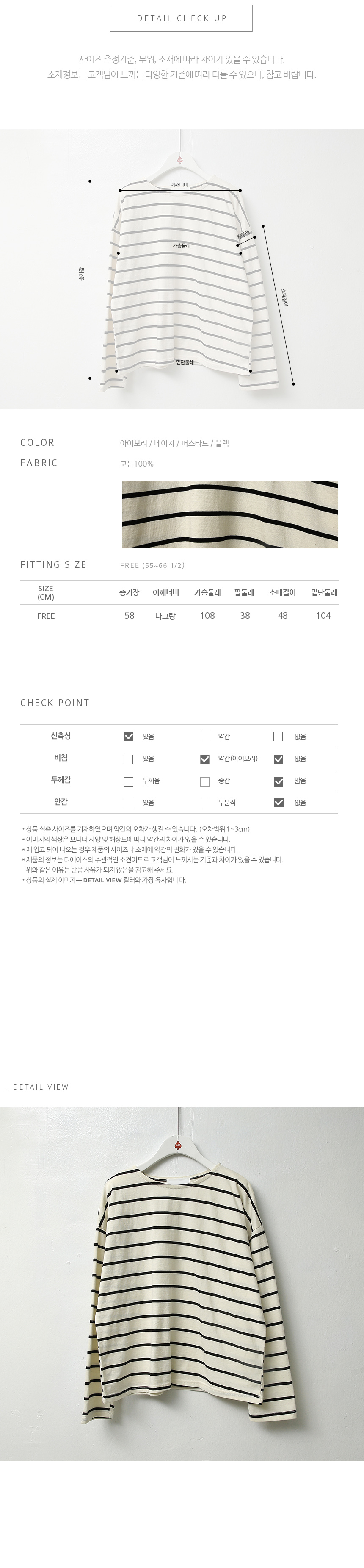 편안한 핏의 스트라이프 코튼 티셔츠한겨울까지 이너로 입기 좋은 편안한 두께감과 핏의 스트라이프 티셔츠예요.골반 선을 살짝 덮는 산뜻한 길이감과 과하게 크지 않아 이너로 입기 부담 없는 편안한 무드의 데일리 아이템이랍니다~색상은 아이보리, 베이지, 머스터드, 블랙사이즈는 FREE 55~66반까지 가능하답니다.