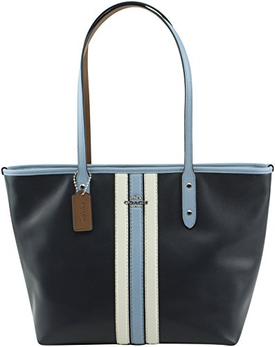 -. Brand : Coach -. Color : Silver Midnight Chalk Multi -. Department : womens -. Feature : Soft solid leather; Top zip closure / Coach & Horse and Carriage logo on front / Coach hang tag; Double flat handles with approximately 10 inch drop / Custom lining with a zip pocket and 2 slip multi-function pockets / Measurement: 10.5" (H) x 16" (L) x 5" (W) -. ProductGroup : Shoes -. ProductTypeName : HANDBAG -. Size : One Size -. Title : Coach Women's Solid Leather Stripe City Zip Tote, Style F59456