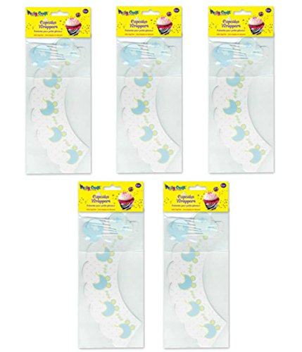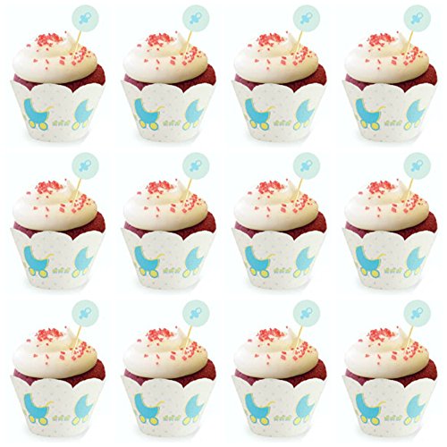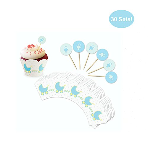 Cupcake Toppers and Wrappers for Boy Baby Shower – Blue Stroller Pacifier Topper Picks And Wrappers – Super Cute Boy Baby Shower Decoration – NO Assembly Required – Set of 30 (Boy Baby Shower)