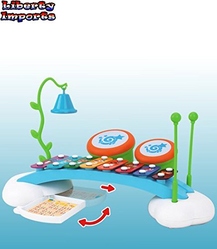 -. Binding : Toy -. Brand : Liberty Imports -. EAN : 0703914092504 -. Feature : Fun and colorful xylophone piano / Tap or slide across 8 xylophone keys to create vibrant sounds / Features ringing bell and 2 drums / Xylophone piano measures 15" x 7" x 4" / Have fun exploring musical notes! -. IsAdultProduct : 0 -. Label : Liberty Imports -. Manufacturer : Liberty Imports -. MPN : 909 -. NumberOfItems : 1 -. PackageQuantity : 1 -. PartNumber : 909 -. ProductGroup : Toy -. ProductTypeName : TOYS_AND_GAMES -. Publisher : Liberty Imports -. Studio : Liberty Imports -. Title : Liberty Imports Rainbow Xylophone Piano Bridge for Kids with Ringing Bell and Drums -. UPC : 783327912323