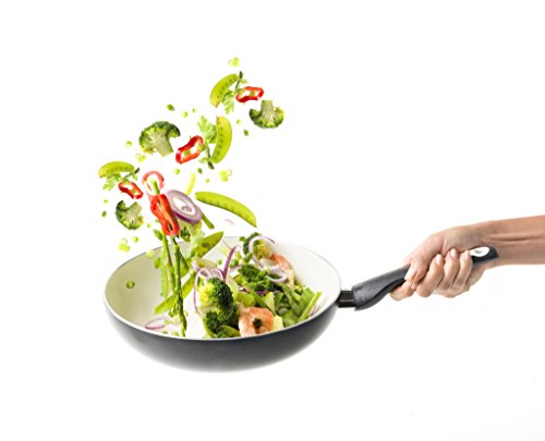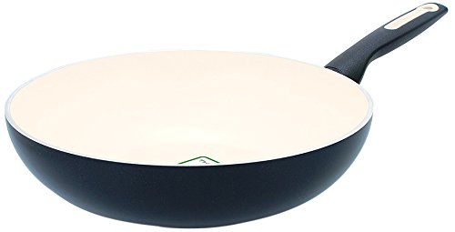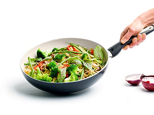 The GreenPan Rio collection brings a touch of color to your kitchen. The Rio 11 Inch Ceramic Non-Stick Open Wok in Black adds a subtle touch of elegance, complete with Thermolon healthy ceramic non-stick coating for ease. Rio offers you a tasteful mix of optimal heat distribution and 100% cooking and cleaning convenience. After all, GreenPan quality also extends to the details, from the stay cool Bakelite handle to the heat retaining base.Feature