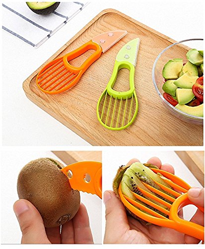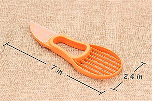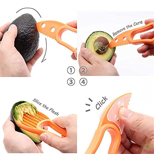 How to use: 1.The plastic blade easily cuts through the skin and fruit of the avocado. 2.The pitting tool allows you to quickly remove the pit with a simple twist - no more dangerous stabbing or losing fruit while digging it out with a knife or spoon. 3.Scoop out the rest of this delicious fruit into perfect slices with the simple and efficient fan blade.