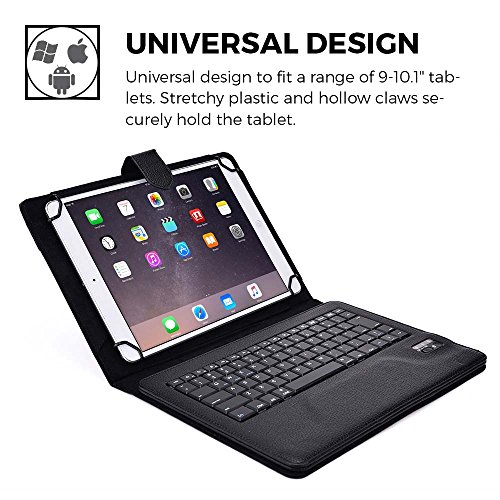 -. Feature : UNIVERSAL DESIGN TO FIT 9 - 10.1" INCH TABLETS - designed to fit any tablet with 9'' to 10.1'' inch screen. Rubberized, silicon covered scratch proof claws tightly fit on 4 corners to hold tablet securely. Claws expand from 5.9'' to 7.2'' width (150-183 mm) & 8.8'' to 10.2'' length (223-259 mm). Open sides provide easy access to all tablet ports, buttons and speakers. / 2-in-1 LEATHER FOLIO CASE WITH STAND & DETACHABLE KEYBOARD - multi purpose functionality > use as compact keyboard folio case or basic folding folio tablet case. Foldout stand supports hands free video screen display. Remove magnetic keyboard tray to turn keyboard cover into classic portfolio case. Premium faux leather protective exterior provides durable, red, shockproof cushion when dropped. Soft suede microfiber interior protects screen from scratches and breaking. / WIRELESS BLUETOOTH 3.0 RECHARGEABLE QWERTY KEYBOARD FOR 9 - 10.1" INCH TABLETS - QWERTY keyboard compatible with Android, Windows and iOS platforms. Easy setup Bluetooth connection automatically connects with tablet. Features 59 laptop-like keys; 12 shortcut keys to tablet's native functions; 10m working range; 100 hour rechargeable lithium polymer battery. / IDEAL FOR TYPING IN BUSINESS, SCHOOL, TRAVEL OR HOME - designed to stand your tablet hands free so you can focus on work, reading, watching videos, typing like on normal computer laptop. Executive looks great for man, woman, students, boys, girls, kids and teens in school. Weighs same as 4 sticks of butter - 470 g / 1 lbs. / RISK-FREE PROMISE - If this case doesn't make typing on tablet easier, doesn't convert your tablet into a laptop and doesn't make you work & study faster, then you are entitled for a full 100% refund - no questions asked! Choose express shipping with DHL - guaranteed delivery in 2-3 days.