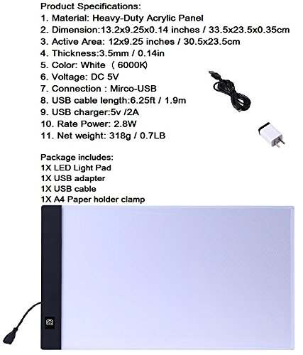 - TOUGH ULTRA THIN design tested for over 5000 uses and guaranteed to outlast all other tracing pads. Comes equipped with eco-friendly flicker-free LED lights, A4 tracing paper clamp, USB cable and instructions manual.