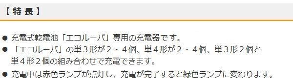 「エコルーバ」の単3形が2・4個、単4形が2・4個、単3形2個と単4形2個の組み合わせで充電できます。充電中は赤色ランプが点灯し、充電が完了すると緑色ランプに変わります。