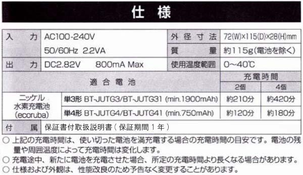「エコルーバ」の単3形が2・4個、単4形が2・4個、単3形2個と単4形2個の組み合わせで充電できます。充電中は赤色ランプが点灯し、充電が完了すると緑色ランプに変わります。 生産国:中国 ※サプライヤー直送品 ご注文後2~3営業日後の出荷となります【商品名】OHM エコルーバ 専用充電器 BT-JUTK1