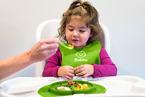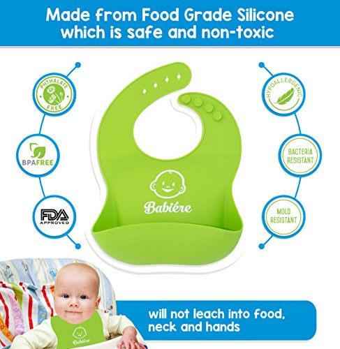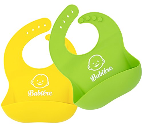 Babiere Waterproof Bibs Easy to Clean – Wide Pocket Catches Most Food and Drink Spills – Adjustable Snaps and Large Torso Great for Toddlers – Food Grade, Baby Safe Silicone – Green & Yellow – 2 Pack