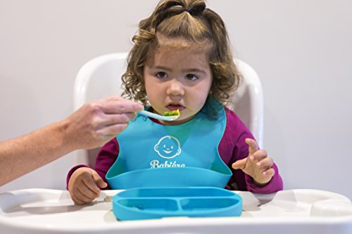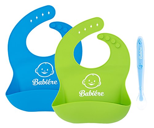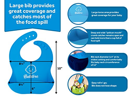Babiere Waterproof Silicone Bibs for Babies - Baby Bib Easily Wipes Clean - Snaps are Toddler Proof - Wide Food Pocket Catches Most Spills - Soft Feeding Bib Easily Rolls Up - Blue & Green - 2 Pack