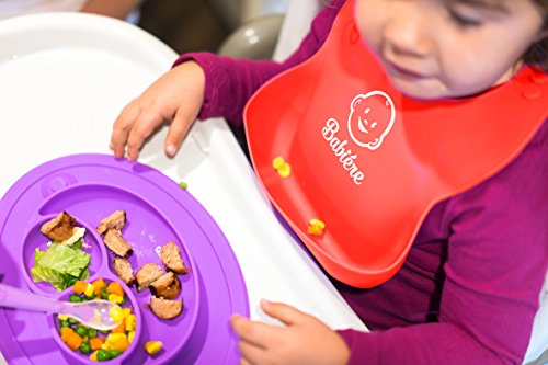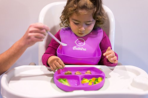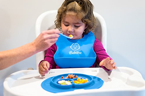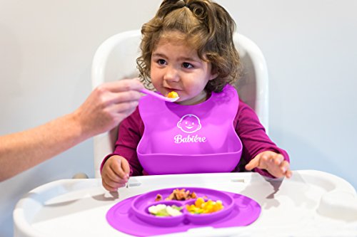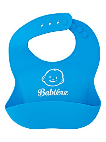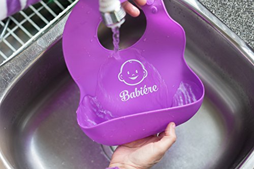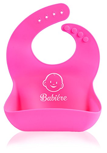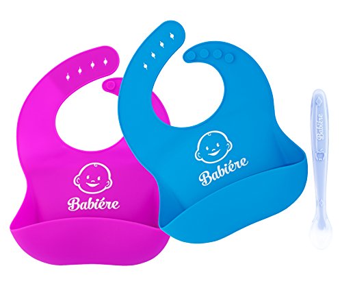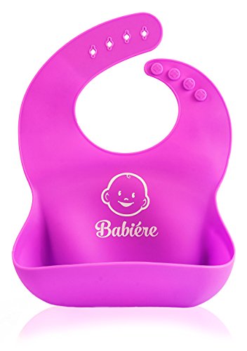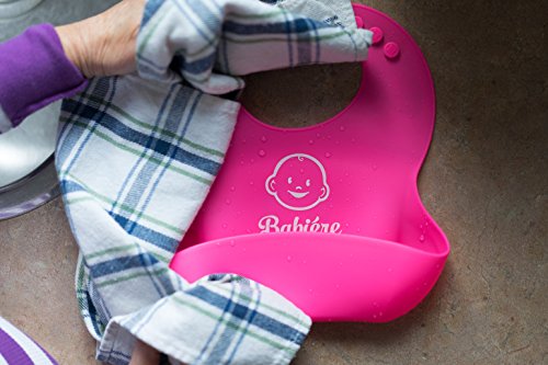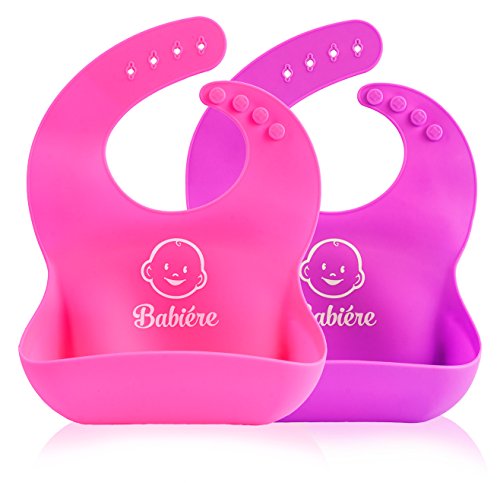 Babiere Silicone Baby Bibs – Adjustable Snaps are Toddler Proof – Wide Food Pocket Catches Most Spills – Waterproof Bibs Easily Wipe Clean – Soft Feeding Bib Easily Rolls Up – Blue & Magenta – 2 Pack