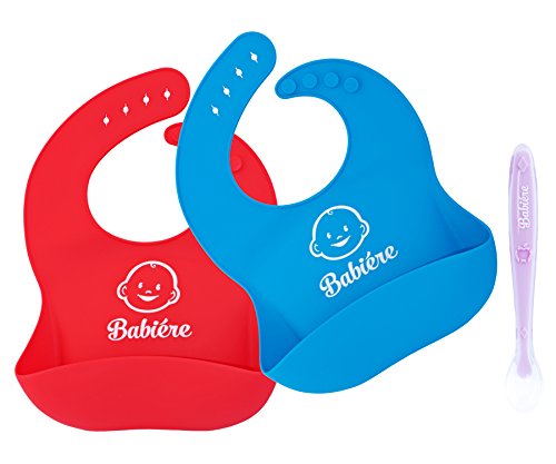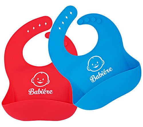 Babiere Soft Silicone Bib is Gentle on Baby - Large Crumb Catcher Pocket Stays Open - Waterproof Bib Easily Cleans and Fast Drying - Adjustable Snaps Fit Infants and Toddlers - Blue and Red - Set of 2