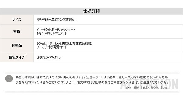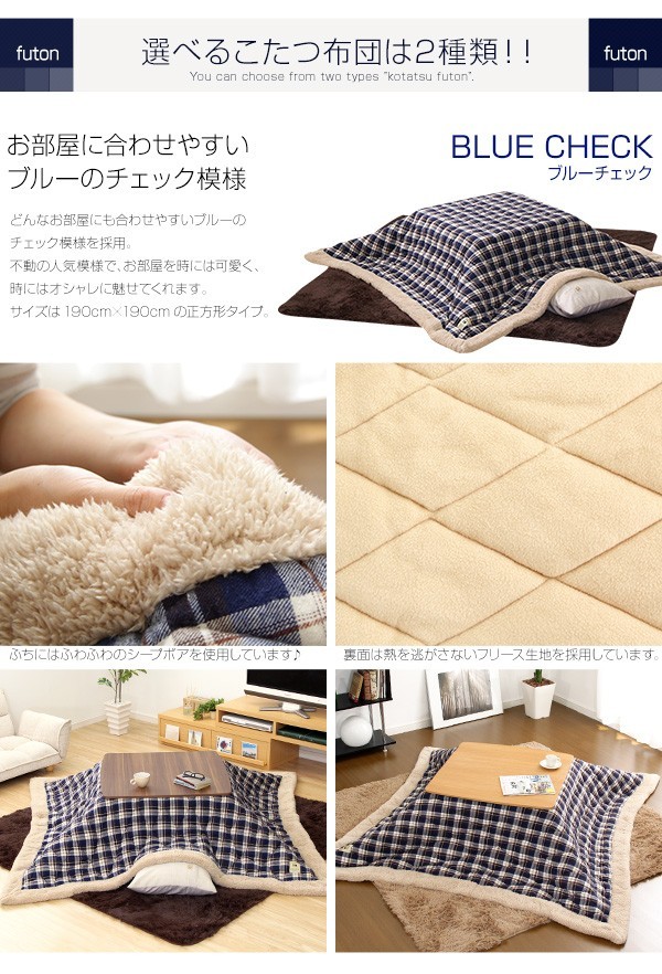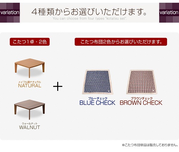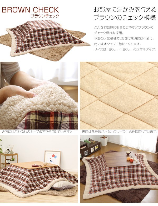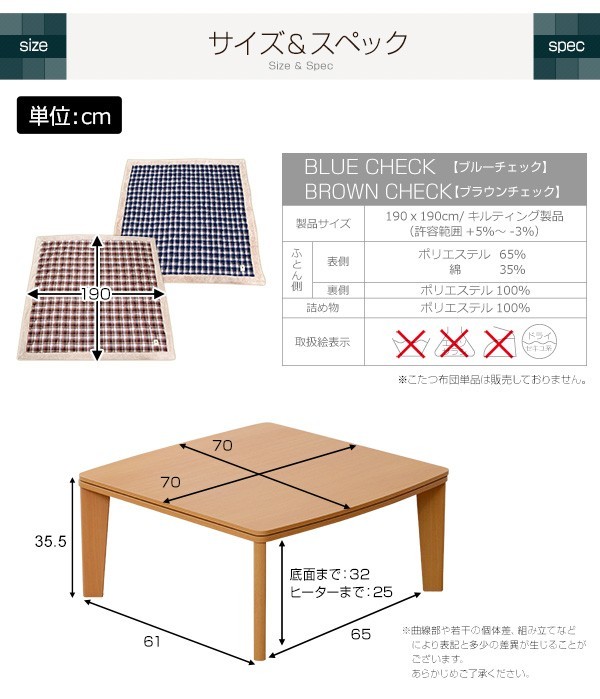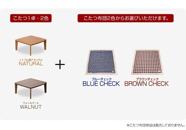 【商品について】チェック柄こたつ布団×こたつテーブル2色から選べる!【カジュアルこたつ2点セット(正方形・70cm幅)】■サイズ:本体外寸:(約)幅70x奥行70x高さ35.5cm(約)11.74kg布団:(約)幅190x奥行190cm(約)3kg■カラー:Aセット Bセット Cセット Dセット■素材:(こたつ本体)天板:パーチクルボード、PVCシート 脚:MDF、PVCシート※付属品:300Wヒーター(メトロ電気工業製)スイッチ付き電源コード(こたつ布団) キルティング製品表側:ポリエステル50%、アクリル30%、その他20%裏側:ポリエステル100%■その他:・完成品でお届けします。※脚はお客様取付け梱包サイズ:本体:(約)73.5x73x11cm(約)12.6kg布団:(約)55x45x25cm(約)4kg