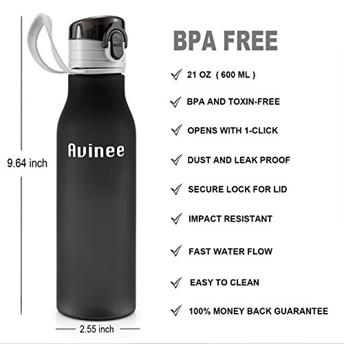 -. Feature : GET REFRESHED FAST - Avinee Premium Sports Bottle flip-top lid lets you take a quick drink while you run, workout or in the middle of the game. 100% leak proof lid to prevent leaks and spills. It's a MUST HAVE sport water bottle for the Gym, Yoga, Runners, Athletes, MMA, Crossfit, Travel, Hiking, Cycling, Tennis, Camping, Work Office, or Outdoors. / 100% NON TOXIC AND BPA FREE - Made from high quality durable Eastman Tritan copolyester toxin free food grade plastic that can hold up to tough conditions. Environmentally friendly, recyclable, reusable, and shatterproof giving you a healthy and less expensive option than bottled water making it the PERFECT GIFT for that active someone on the go. / EASY TO CARRY AND EASY TO USE - The Avine Sports Bottle includes a convenient carrying lanyard handle that lets you wear your bottle on your wrist or attach it to your belt or bag, so you can take it anywhere. The one click spill proof lid will swing opens easily with the push of a button with one hand. Easy to clean and TOP-RACK DISHWASHER SAFE. / SMART ERGONOMIC DESIGNED, PERFECTLY SIZED BOTTLE - The stylish and ergonomically shaped Avinee Sports Bottle fits comfortably in your hand and perfectly into your cup holder or water bottle bike cage. The 21 ounce, 600 ml, size is perfect for life on the go. / GUARANTEED PURCHASE - We know you have options here, and we want to make the best choice the easiest one, and that's why we offer a 100% Satisfaction Gaurantee! If for any reason our product doesn't meet your standards, just send it back our way for a replacement or a full refund! The choice will be yours!