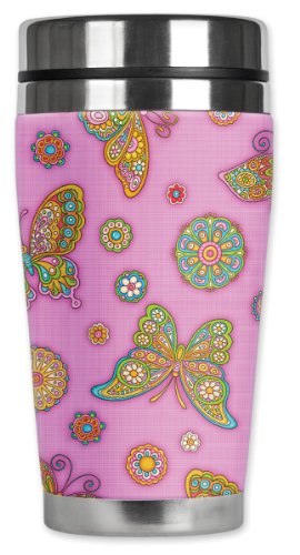 Mugzie Paisley Butterflies Travel Mug with Insulated Wetsuit Cover, 16 oz, Pink