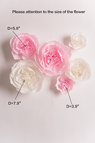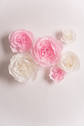 This is listing for set of 6 premium quality crepe paper flowers (Pink, White Designs) handmade with great care! Gorgeous breathtaking flowers for special moments... Perfect for nursery wall decor, wedding backdrop, shop window display, etc. For my flowers I use rich Premium Quality Crepe paper. The brilliant colors and vibrant texture of the crepe creates a lively and more realistic flower for your enjoyment. The material itself looks and feels more like a sturdy fabric - resilient and long-lasting. Note that colors of the paper for flowers will vary slightly due to monitor settings. Thank you for visiting my Shop!Feature