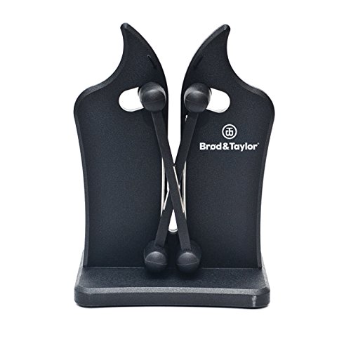 The Brod & Taylor knife sharpener makes professional-quality sharpening at home foolproof - even for serrated knives. So simple to use anyone can achieve excellent results in seconds, even with very dull or damaged knives. The sharpener excels with all types of knives, including serrated blades and Japanese-style (single beveled edge) knives. High-quality Damascus blades can be honed without fear of damaging the edge. The unique sharpening technology features precision-ground ultra-hard carbide sharpeners on patented spring-action bars that adjust automatically to accommodate different blade angles. Three different sharpening methods are available with one tool. Damaged, nicked or very dull knives can be coarse-sharpened to restore a perfect "V" shape to the edge. With a simple change in hand position, all knives can be fine-sharpened (honed) as often as desired. Regular honing will maintain a sharp edge without removing metal and actually extend the lifetime of a blade. And for a super-sharp edge, smooth blades can be polished to a micro-bevel. Serrated and single-bevel knives are sharpened just by angling the knife handle to the side. Solid construction with durable PA66 Nylon.Feature