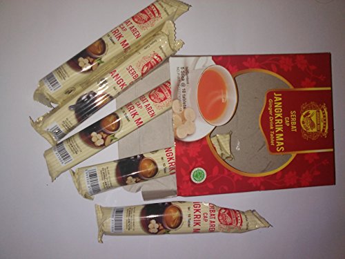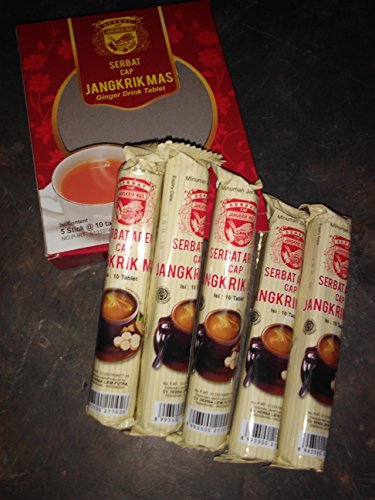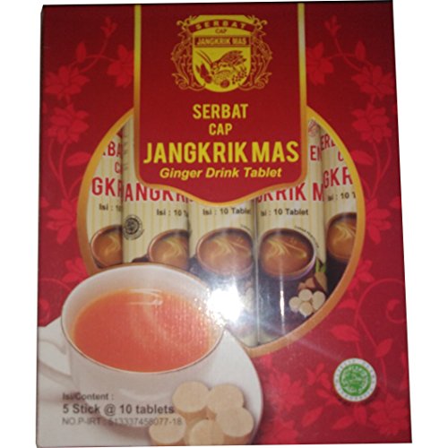 -. Binding : Misc. -. Brand : Cap Jangkrik Mas -. EAN : 8993500211026 -. Feature : Product of Indonesia / Halal certified product / Just mix 2 or 3 tablets with a cup of hot water or coffee / tea / milk / Can also be chewed as ginger candy / 5 stick, 10 tablets each stick. (total 50 tablets) per order -. IsAdultProduct : 0 -. Label : CV. Herbal Liem Putra -. Manufacturer : CV. Herbal Liem Putra -. MPN : SERBAT AREN -. NumberOfItems : 5 -. PackageQuantity : 5 -. PartNumber : SERBAT AREN -. ProductGroup : Grocery -. ProductTypeName : GROCERY -. Publisher : CV. Herbal Liem Putra -. Studio : CV. Herbal Liem Putra -. Title : Serbat Cap Jangkrik Mas - Ginger Drink Tablet with Brown Sugar, 5 Stick (5 x 10 Tablets)