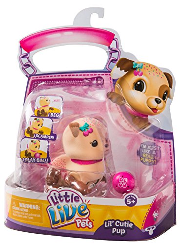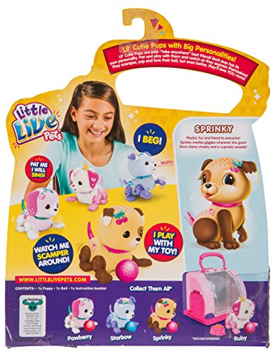 -. Binding : Toy -. Brand : Little Live Pets -. Color : Brown -. EAN : 0630996284889 -. Feature : Say hello to the Lil' Cutie Pups! The latest members of the Little Live Pets family! / Watch them beg and scamper for you! / Each puppy comes with a ball that they play with! / Pat them and they'll sing for you! -. Label : Moose Toys -. Manufacturer : Moose Toys -. Model : 28488 -. MPN : 28488 -. NumberOfItems : 1 -. PackageQuantity : 1 -. PartNumber : 28488 -. ProductGroup : Toy -. ProductTypeName : TOYS_AND_GAMES -. Publisher : Moose Toys -. ReleaseDate : 2018-01-01 -. Size : 3.12'' x 2.24'' x 2.7'' -. Studio : Moose Toys -. Title : Little Live Pets S1 Cutie Pup Single Pack - Sprinky -. UPC : 630996284889 -. Warranty : No Warranty