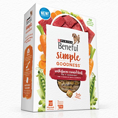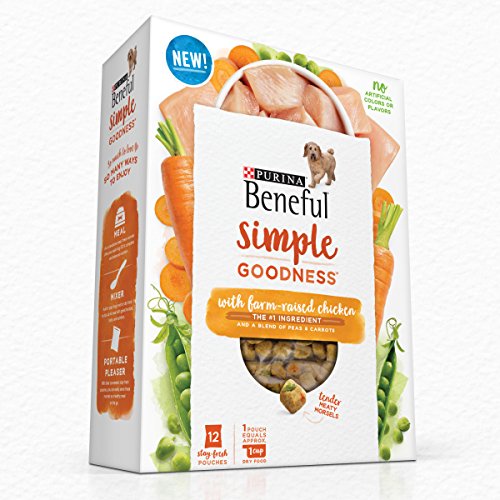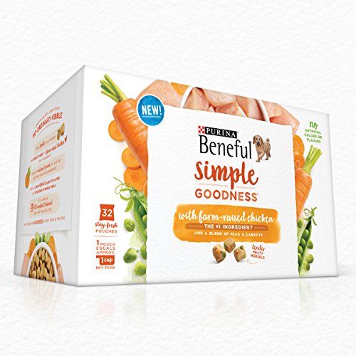 Get your devoted dog's tail wagging at feeding time when you offer him Purina Beneful Simple Goodness With Farm-Raised Chicken adult dry dog food. Real farm-raised chicken is the #1 ingredient in this recipe, a blend of real peas and carrots you can see, and wholesome ingredients in every bite. The tender, meaty morsels offer a tempting texture and delicious taste your dog is sure to lick his chops for, while the high-quality ingredients in every serving let you feel good about the food you put in his dish. This dog food can be served as a standalone meal, a dog treat or a meal mixer, making it a versatile addition to your dog's routine. You don't like to wait for your pet food order to arrive any more than he likes to wait for dinner. Get this Purina Beneful dry dog food recipe quickly when you order it from Amazon.com. Once the shipment conveniently arrives at your door, you can give him a nourishing recipe formulated without artificial colors, flavors and chicken by-product meal.Feature