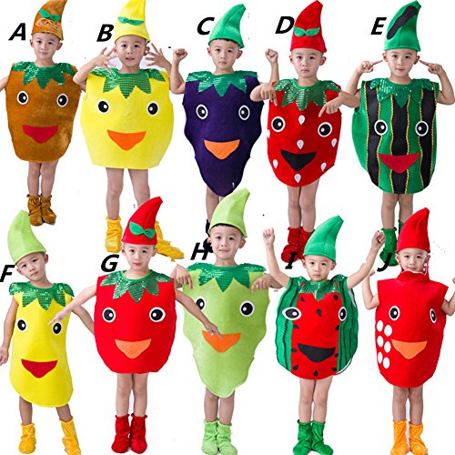 -. Feature : Package include: Hat, Suit, Shoe covers / Very skin-friendly material / Great for trick-or-treat, birthday present, photography props, dress-up, costume parties, or putting on a show;Fun, Cool, Inventive designs to put you in the world of role play / Character: All kinds of fruits, fits for both Boys and Girls at Halloween and Christmas Party. / Please choose the size according to your height!!!
